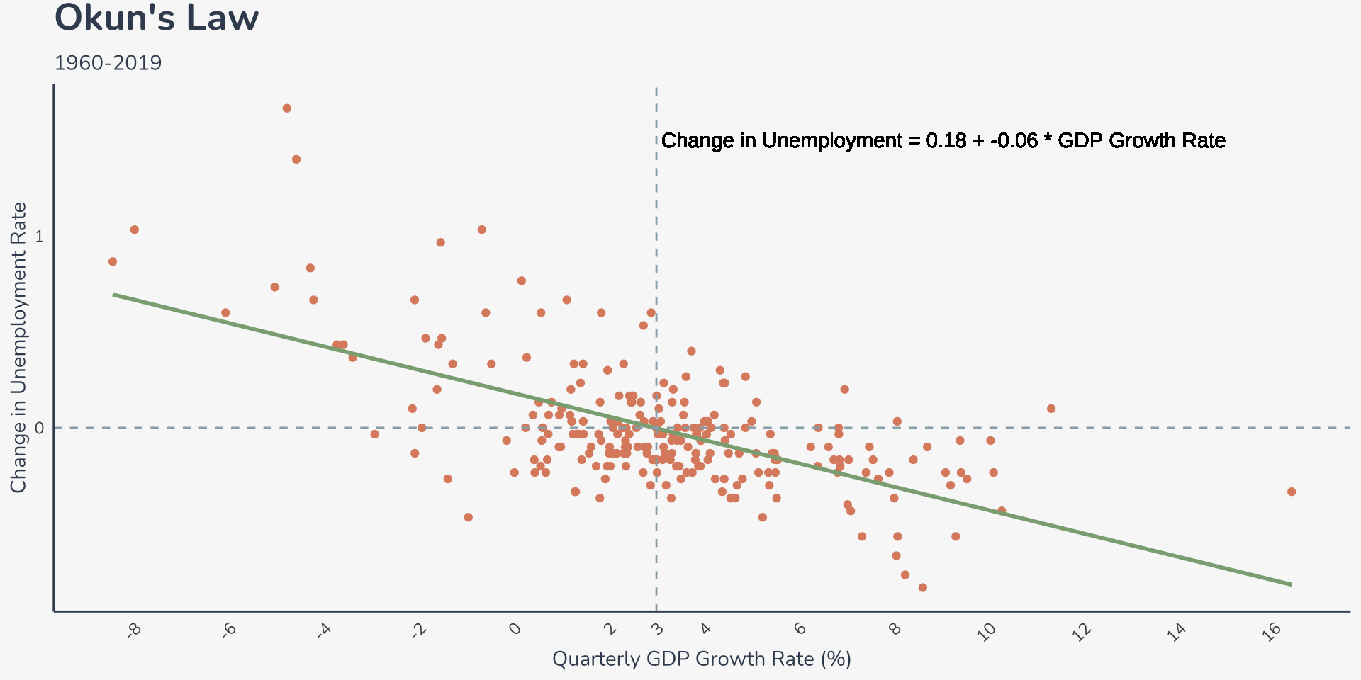 Quantifies the empirical relationship between changes in the unemployment rate and real GDP growth.
